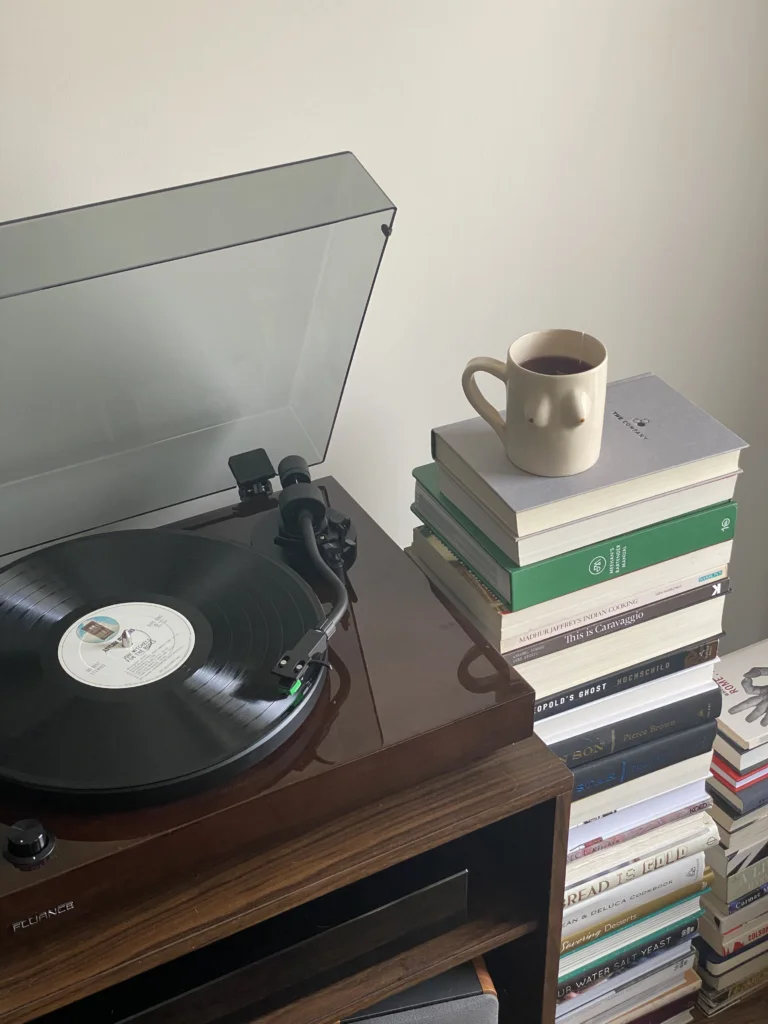Vintage vinyl record player with custom album featuring couple’s personal music collection.