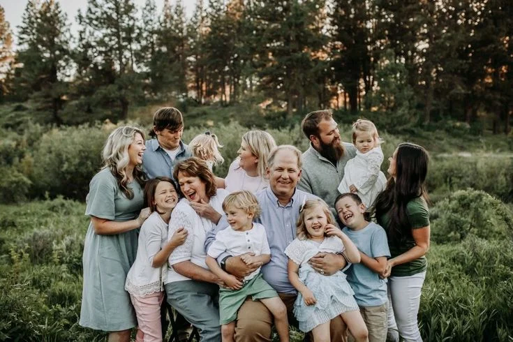 Multi-generational family portrait with grandparents, parents, and children smiling together outdoors.