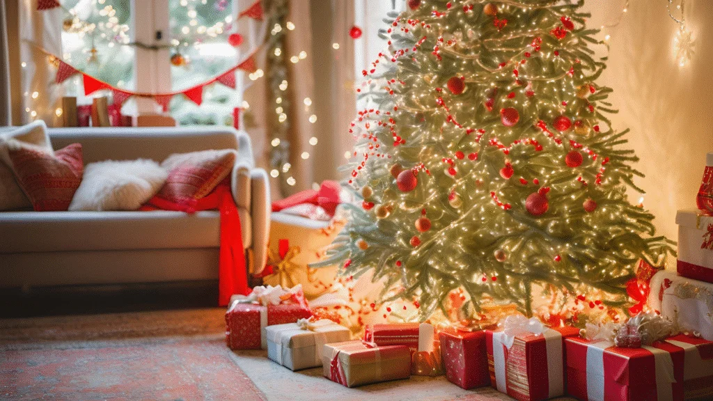 Picture this: a magnificent tree draped in twinkling lights and red beaded garlands, presents wrapped in festive paper scattered beneath, and the warm glow of home filling every corner. This one’s perfect if you love that traditional, cozy Christmas feeling—the kind that makes you want to curl up with hot cocoa and holiday movies.