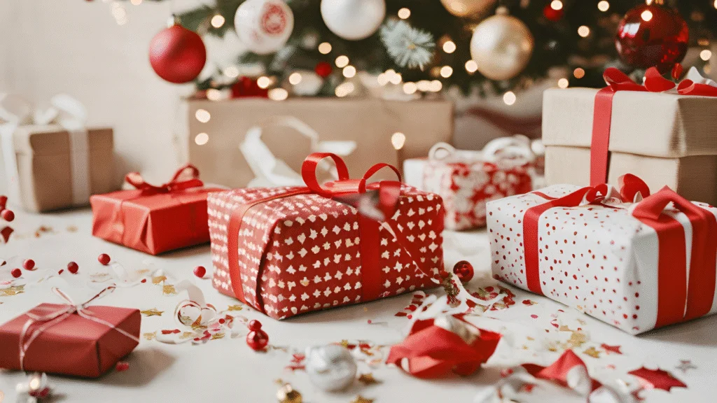 This close-up beauty showcases beautifully wrapped presents in classic red and white patterns—polka dots, tree prints, and satin ribbons curled to perfection. It’s like peeking into Santa’s workshop! If you’re someone who loves the art of gift-giving (or just appreciates pretty paper), this wallpaper will make your heart sing.