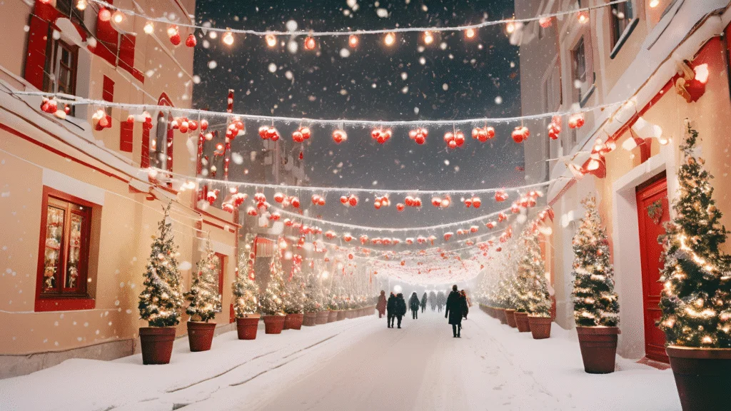 Imagine strolling down a charming European street transformed into a Christmas fairy tale. String lights and snow-dusted ornaments hang overhead, potted evergreens line the walkway, and snow gently falls as people wander through the magic. It’s escapism at its finest, and honestly? We all need a little of that sometimes.