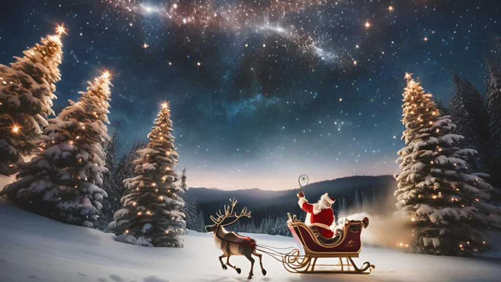 This breathtaking scene shows Santa in his sleigh with his trusty reindeer, set against an absolutely stunning starry night sky with illuminated snow-covered pines framing the scene. It’s the kind of image that reminds you that magic is real—you just have to believe in it.