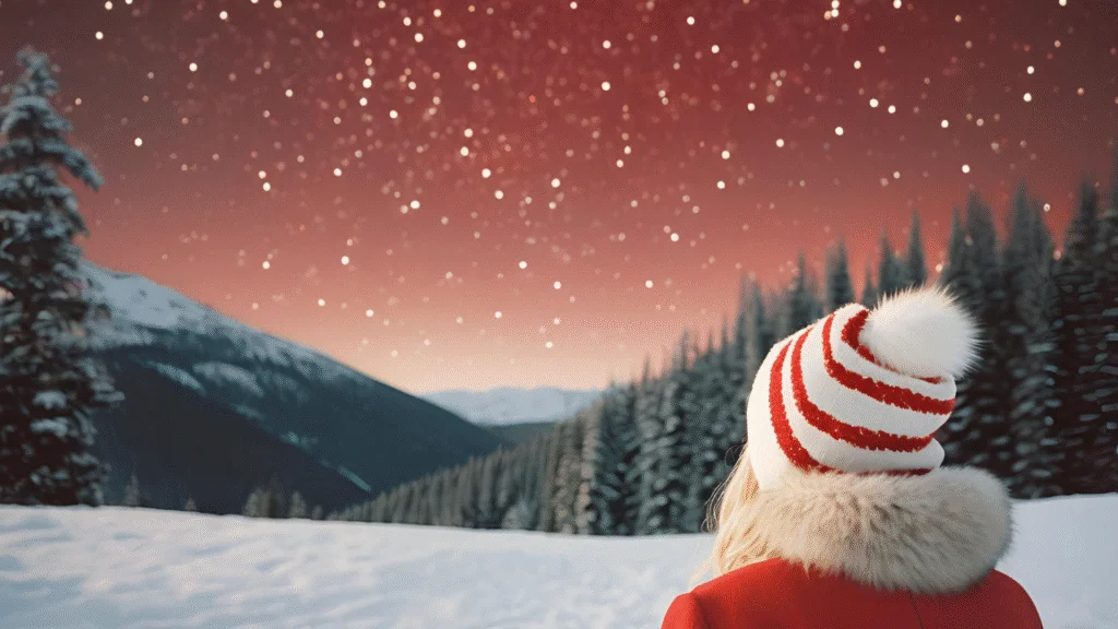A child in a festive striped Santa hat gazes out at a snow-covered mountain landscape painted in the most gorgeous peachy-pink sunset colors. This one hits different—it’s about the quiet wonder of the season, those peaceful moments when you just take it all in.
