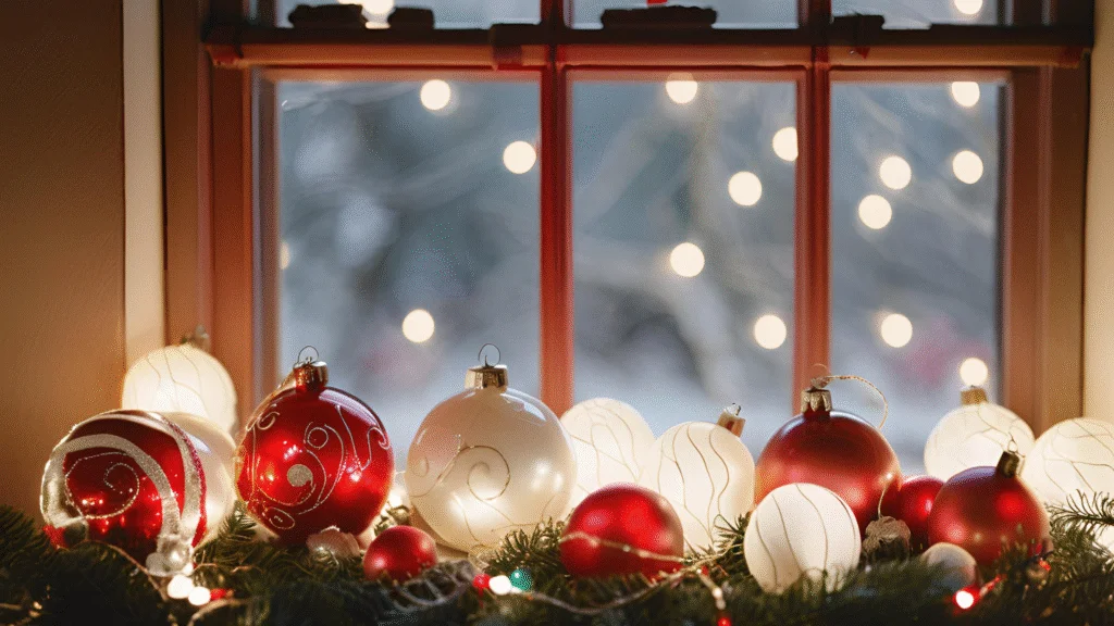 This elegant close-up features classic red and cream ornaments with delicate swirled designs, arranged on a windowsill with evergreen branches and twinkling bokeh lights in the background. It’s sophisticated, warm, and just the right amount of festive without being overwhelming.