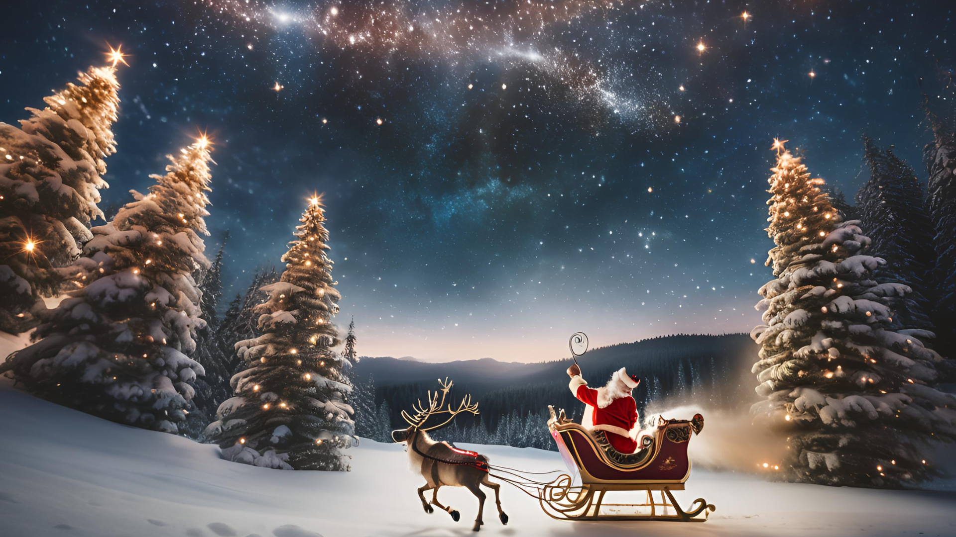 This breathtaking scene shows Santa in his sleigh with his trusty reindeer, set against an absolutely stunning starry night sky with illuminated snow-covered pines framing the scene. It’s the kind of image that reminds you that magic is real—you just have to believe in it.
