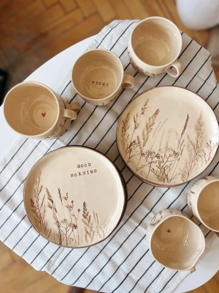 These cream-colored plates by @izavgorodnia featuring delicate wheat imprints and hidden text (“GOOD MORNING” ) tap into nostalgia and personal meaning. The matching mugs create a complete breakfast experience.