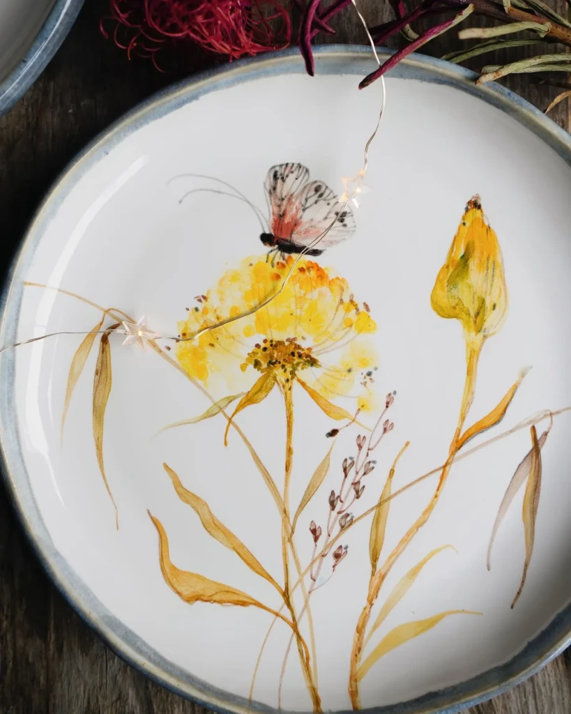 This delicate hand-painted plate by @jane_and_mery_potteryandglass featuring a butterfly on golden wildflowers represents a perennial bestseller category. Botanical designs appeal to a broad customer base and work across multiple seasons.