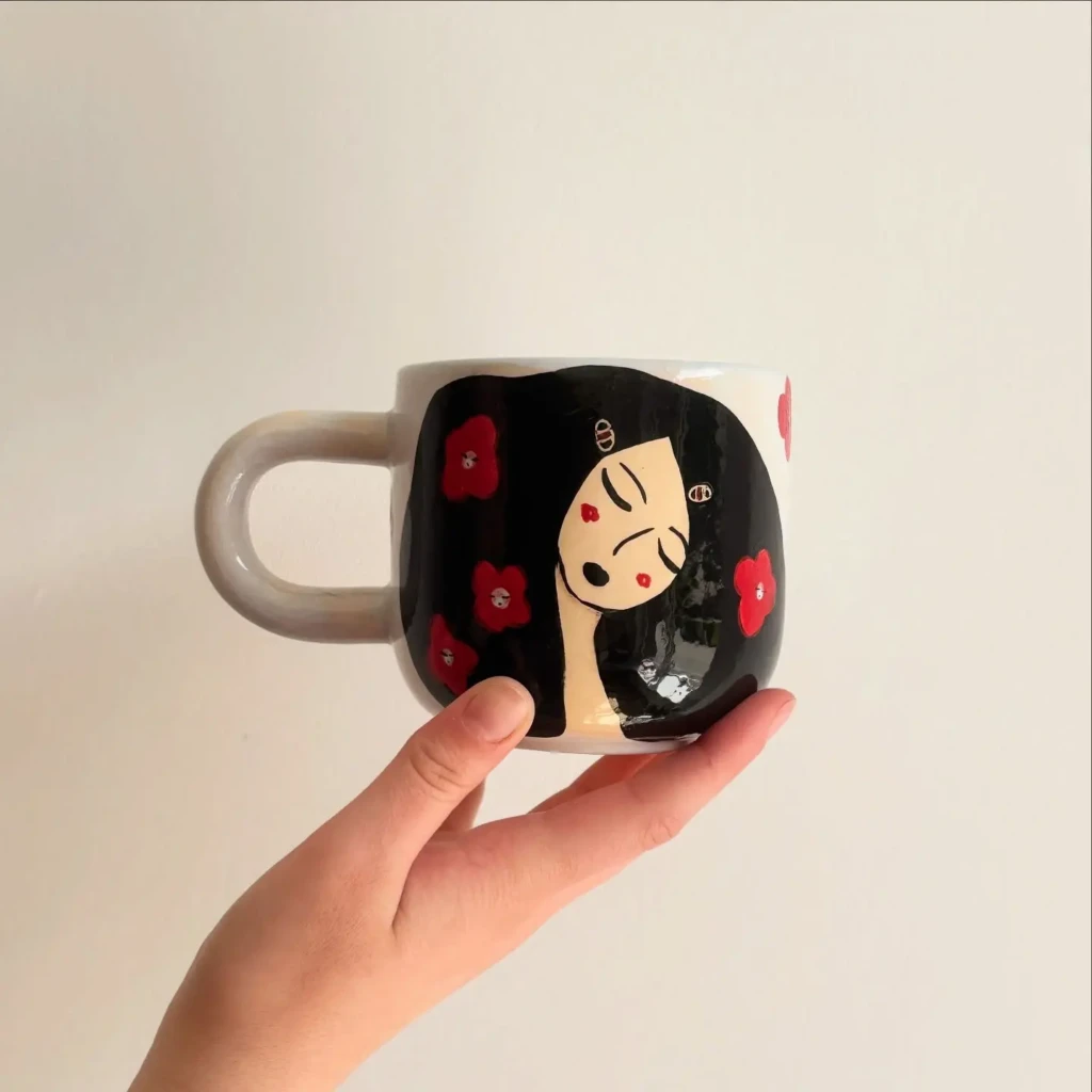 This artistic mug by @ksenaceramics featuring a woman’s portrait with black hair and red flowers demonstrates how character work can become your signature. The folk-art style and bold color blocking create instant recognition.