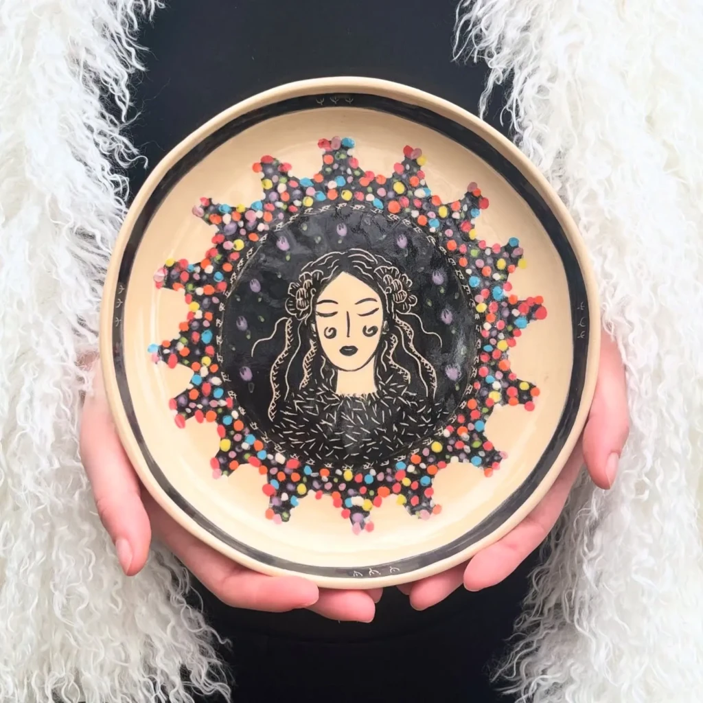 This striking portrait plate by @ksenaceramics with its intricate multicolored border represents handmade ceramic dishware positioned firmly in the “art piece” category. The contrast between the dark portrait and vibrant dotted border creates visual drama.