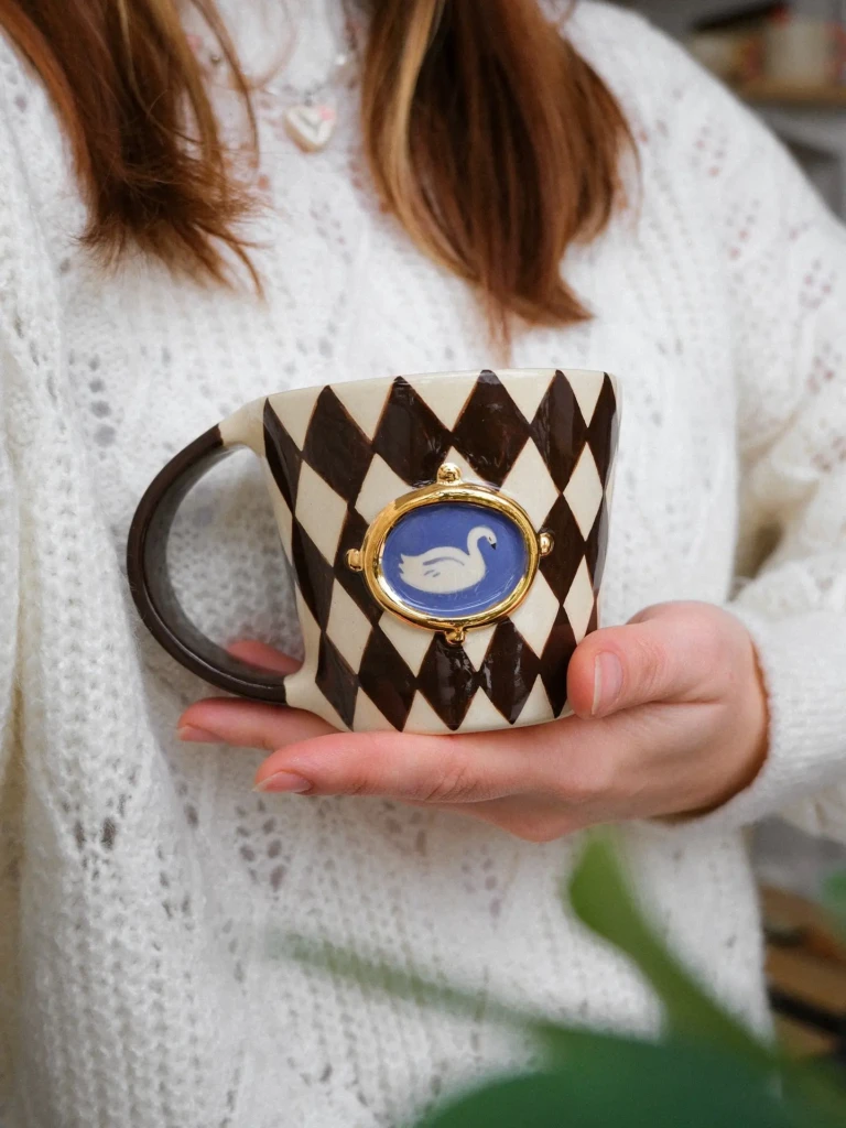 Harlequin Pattern Mug with Swan Medallion (@starry.zvir.studio)