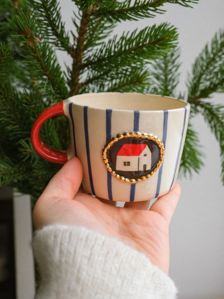 These striped mugs by @starry.zvir.studio (one with a red flower cameo, another with a house scene) show how you can create variation within a cohesive collection. The consistent striped background ties them together while the different medallions create individual character.